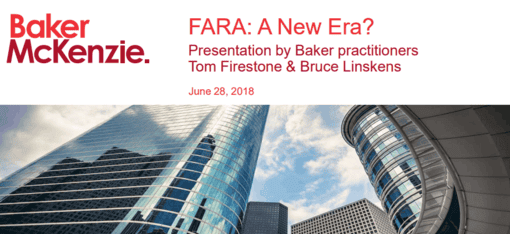 Following a brief introduction of recent FARA developments in the news and a background of the law, the discussion considered the 2016 DOJ Inspector General report on FARA recommending a comprehensive enforcement strategy, and the recent DOJ release of all of its advisory opinions under FARA since 2010, particularly as they relate to allowable exemptions under the law. Speakers Tom Firestone and Bruce Linskens, who recently worked together to obtain a favorable decision from DOJ for a client in a FARA investigation, shared their experiences from handling various FARA-related matters and DOJ investigations, and discussed the future of FARA enforcement and proposed legislation to update and revise the law.