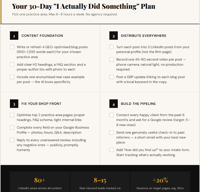 Pick one practice area. Then over the month: write or refresh four short GEO-optimised posts in the 800 to 1,200-word range; turn each one into three LinkedIn posts, one short video, and one GBP update; tighten the top two pages on your practice area with proper headings, FAQs, and an author bio with a real photo; and ask every happy client from the past six months for a Google review, targeting five to eight new ones.