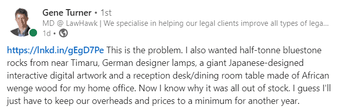 LawTech entrepreneur Gene Turner noted the run on the top-end accoutrements that the fit out required –