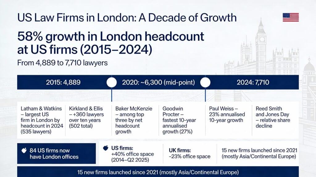 The number of lawyers working in London offices of U.S.-headquartered firms rose from 4,889 in 2015 to 7,710 by the end of 2024, a 58 percent increase over ten years.