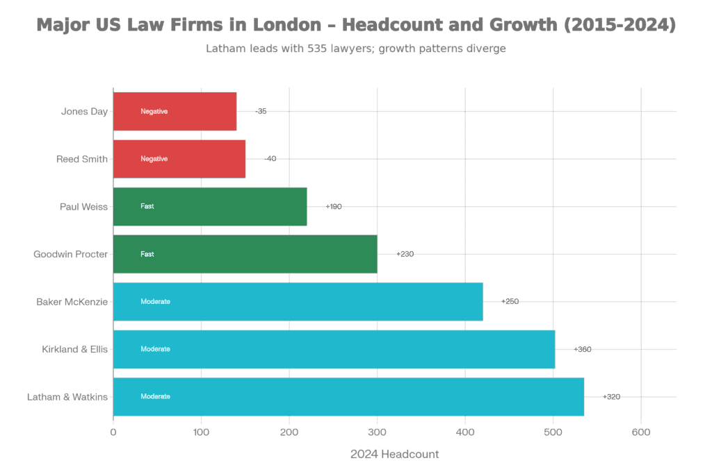 Latham & Watkins now stands as the largest U.S. firm in London by lawyer count, with 535 lawyers in 2024, while Baker McKenzie posted the third-highest 10‑year net increase after previously holding the top spot in 2020.